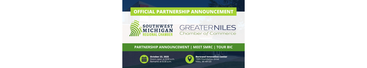 Join us on Wednesday, October 22, 2025, at the Bertrand Innovation Center, 1905 Foundation Drive, Niles, MI 49120, for a press conference announcing the official partnership between the Greater Niles Chamber of Commerce (GNC) and the Southwest Michigan Regional Chamber (SMRC).