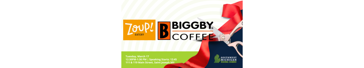 Join us as we celebrate new ownership at Zoup! Eatery and BIGGBY Coffee in downtown St. Joseph! Stop by on Tuesday, March 17th from 12:30–1:30 PM as we officially welcome the new owners and celebrate their continued investment in our local business community.